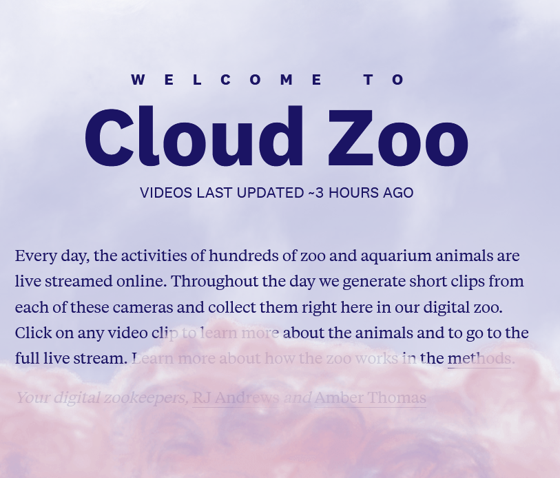 Welcome to the Cloud Zoo. "Every day, the activities of hundreds of zoo and aquarium animals are live streamed online. Throughout the day we generate short clips from each of these cameras and collect them right here in our digital zoo. Click on any video clip to learn more about the animals and to go to the full live stream." Come for the puffins, stay for the snow monkeys.