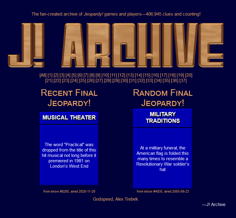 J! Archive is a fan-created archive of Jeopardy! games and players. There are 406,945+ clues from the 37 seasons of the show. Godspeed, Alex Trebek.